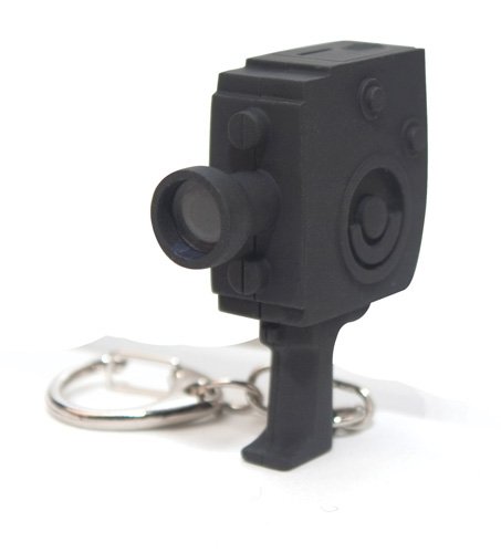 Replica Movie Camera Keychain with LED light. Please note: Aside from the LED light, this item is non-functional (does not record movies).